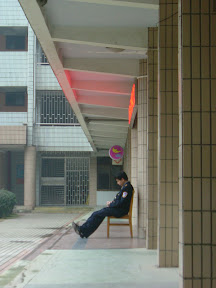 在南楼中厅的大橱窗里浏览附中的奖状,觉得技术含量大不如前。中间放着校运会摄影比赛的作品和一些艺术节的东西倒是挺有意思的,附中现在也没有从前那么多苛刻的校规了,学术上的东西也少了,课外活动丰富起来了,我们那时奥班的生活是要单调得多。寒假值班的保安看起来也很无聊,在中厅打起了瞌睡(上图)。不爽的是我要离开时被当作可疑人员,盘问了半天。