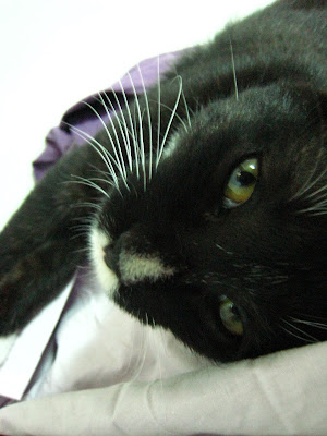 有时候我也会看着它猜想它的身世到底如何, 为什么会在那个晚上蹲在我家门口. 它的前任主人叫它什么名字? 给它喂啥吃? 它妈妈长啥样? 它妈妈是黑猫呢还是它爸爸是黑猫? 白天我不在的时候它是不是会像妖精一样现出原型, 变成…黑猫警长? 专门吃苍蝇的猫怪兽? 或者变成一只黑白相间的枕头也行, 一只毛茸茸的枕头.